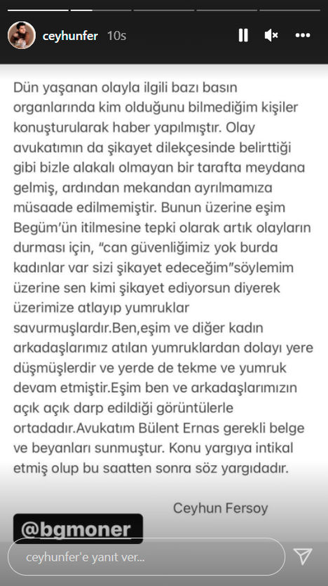 Dün yaşanan olayla ilgili bazı basın organlarında kim olduğunu bilmediğim kişiler konuşturularak haber yapılmıştır. Olay avukatımın da şikayet dilekçesinde belirttiği gibi bizimle alakalı olmayan bir tarafta meydana gelmiş, ardından mekandan ayrılmamıza müsaade edilmemiştir. Bunun üzerine eşim Begüm'ün itilmesine tepki olarak, artık olayların durması için, "Can güvenliğimiz yok. Burada kadınlar var. Sizi şikayet edeceğim!" söylemim üzerine, "Sen kimi şikayet ediyorsun?" diyerek, üzerimize atlayıp, yumruklar savurmuşlardır.