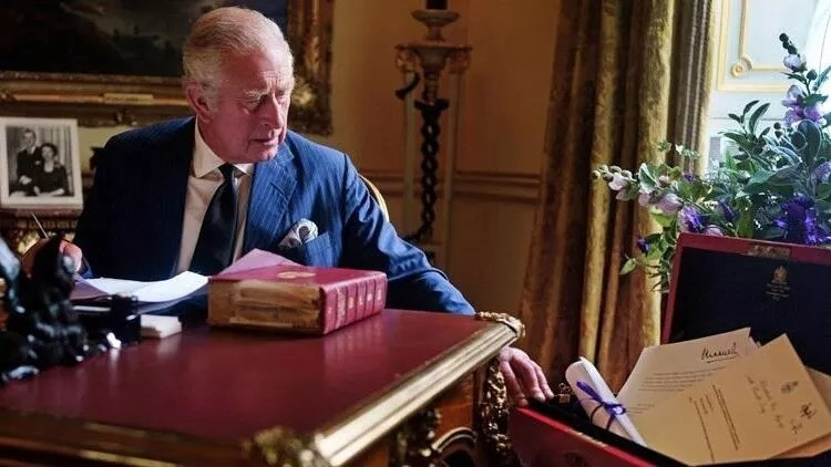 Saray tarafından paylaşılan fotoğrafta Charles yaldızlı bir masada oturuyor ve yanındaki açık kırmızı kutuda biri kurdeleyle bağlanmış önemli kağıtlara uzanıyor.