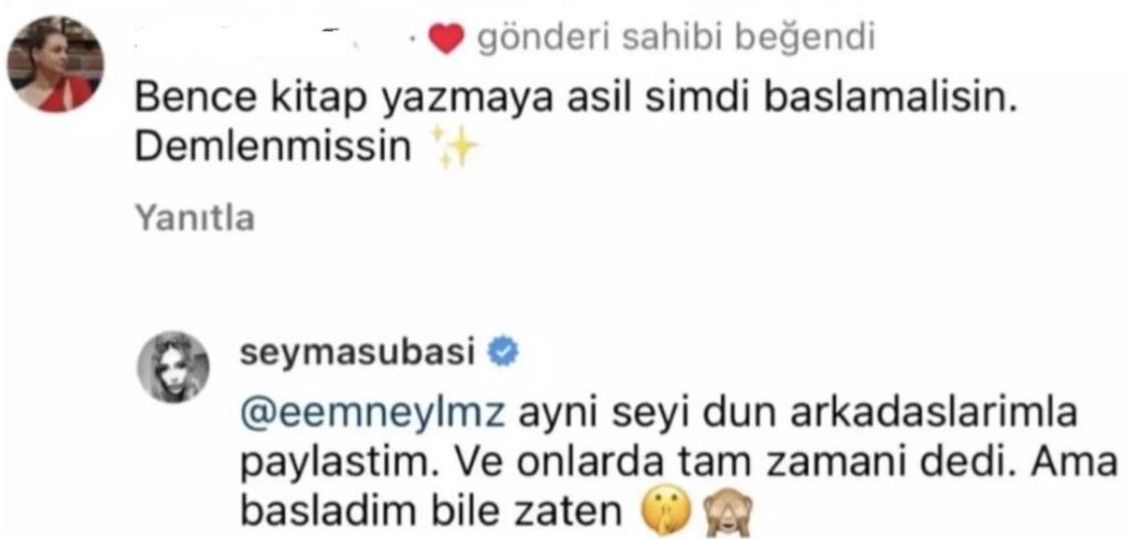 Şimdilerde sosyal medyadaki iddialı ve cesur tarzıyla dikkat çeken Subaşı takipçisine verdiği bir yanıtla gündem oldu. Subaşı'nın elinde kitapla uzandığı bir pozuna takipçisi 'Bence kitap yazmaya asıl şimdi başlamalısın. Demlenmişsin' yorumunu yaptı. Şeyma Subaşı ise bu yoruma kayıtsız kalmadı.